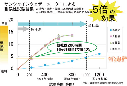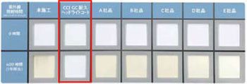 ※黄ばみ防止効果 ![]() ※耐候性試験結果 ![]() GC耐久ヘッドライトコートは 400時間を経過しても紫外線による劣化が認められません |