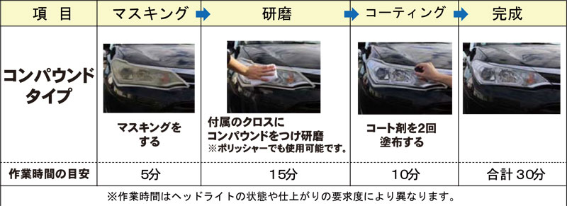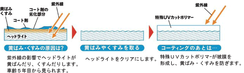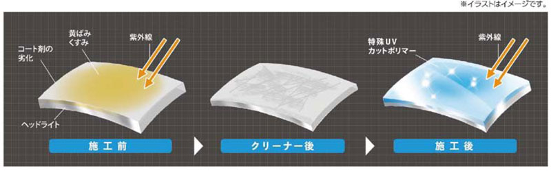 メカニズムヘッドライトの樹脂、ポリカーボネイトは紫外線の影響で劣化し、黄ばんだりくすんだりします。 GC耐久ヘッドライトコートはクリーナーで研磨することにより、ヘッドライト表面の黄ばみやくすみを簡単に除去できます。 さらに2液混合液のコーティングが特殊UVカットポリマー被膜を形成し、紫外線を吸収、樹脂の劣化を防止します。 ![]() 施工手順![]() ※ポリッシャーで研磨する場合は、時間短縮が可能となります。 |